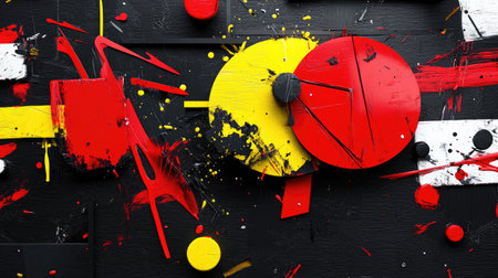 Sharp-edged dark shapes layered with chaotic red and yellow paint splatters on matte surface