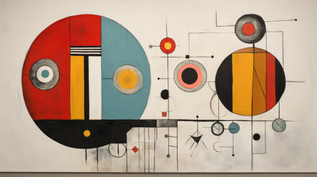 a large-scale art print showcases a mesmerizing blotch of multicolored circular shapes in various positions. this abstract piece, inspired by modular constructivism, is created using oil on panel. the vibrant colors of aquamarine and amber add depth and intrigue to the composition. the artwork incorporates elements of kinetic lines and curves, reminiscent of nostalgic subjects found in black paintings and large-scale murals. ai generated