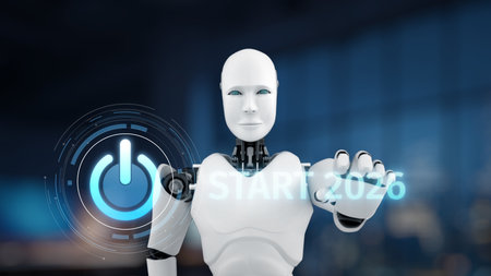 A sleek humanoid robot interacts with a digital display showing a power button. The image represents innovation in technology and automation for the year 2026.