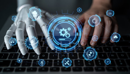 This image features a robotic hand pointing at a digital display of automation concepts, showcasing technological advancements in business and industry settings.