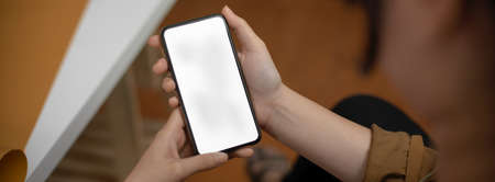 Close up view of a woman holding mock-up smartphone while sitting in office room