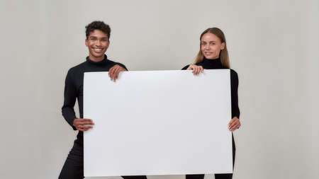 Two friends posing and showing empty white blank board with copy space for text or ad together on white wall background