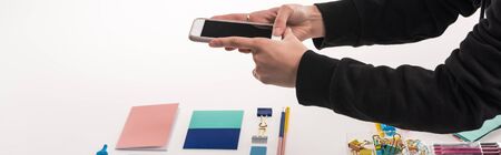 cropped view of commercial photographer making photos of flat lay with office supplies on smartphone, panoramic shot