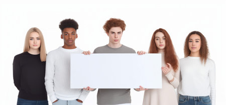 Group of beautiful people in formalwear holding sale banner and smiling while standing against white background : Generative AI