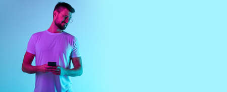 Cropped portrait of man holding phone with disappointed facial expression isolated over blue background in neon lights. Flyer