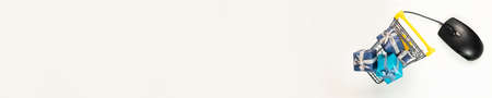 Online shopping concept. Trolley or cart full of wrapped gift boxes with computer mouse on white background. Top view. Extra long banner with copy space or place for text.