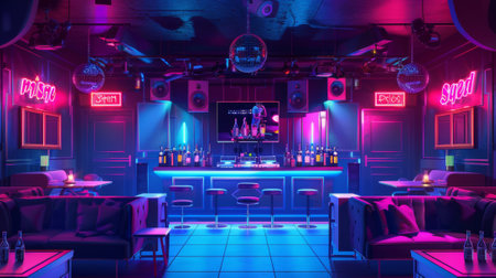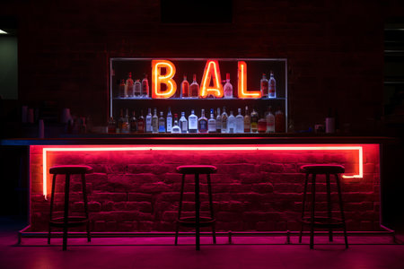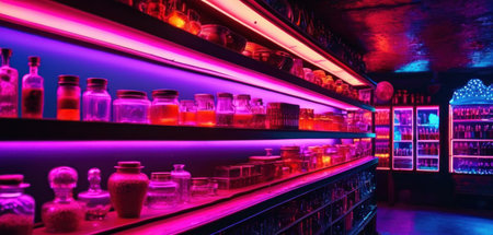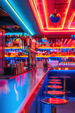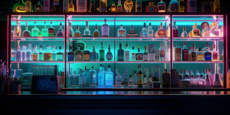 Interior of a bar with bottles of alcoholic beverages. Neon lights.