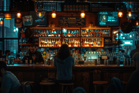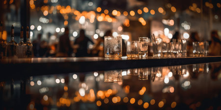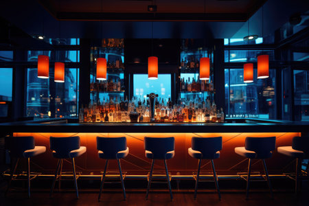 Illuminated bar counter reflects modern cocktail celebration generated by artificial intelligence