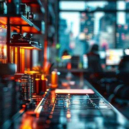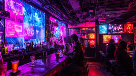 Cyberpunk Cocktail Bar with Interactive AI Bartender - Textured black steel floors, illuminated geometric bar counter, AI-powered mixology station, neon