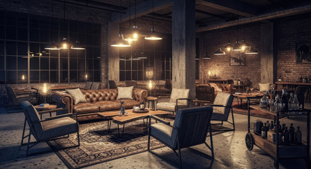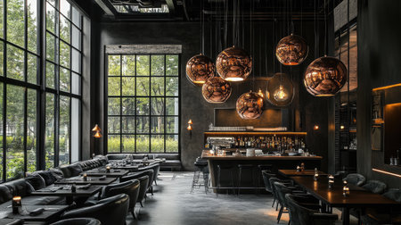 An industrial-inspired modern loft with copper chandeliers, dark decor, and large windows that bring in abundant natural light, creating a trendy atmosphere.
