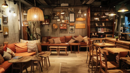 Rustic-style cafe with handcrafted wooden furniture, dim lighting, and a cozy, welcoming ambiance.