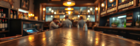 Polished dark wooden bar top in sharp focus, reflecting warm lights, with a blurred high end cocktail lounge and a bartender in the background. ideal for concepts of nightlife, luxury, and relaxation.