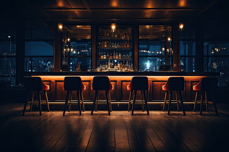 Bar interior with bar chairs and lights at night. Night scene. Bar counter in the dark night background with chairs in empty comfortable luxury restaurant, AI Generated