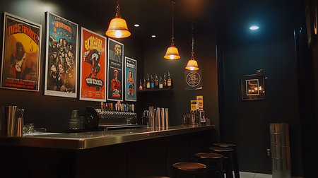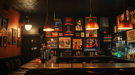 Discover a vibrant bar setting adorned with vintage posters inviting you to unwind in a stylish urban environment.