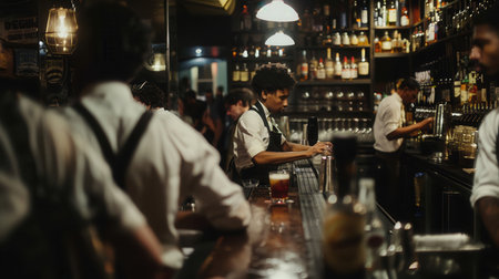 Young bartenders working in crowded and dark bar. Cozy and warm pub interior