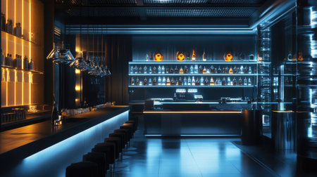 Elegant bar interior with illuminated liquor bottles on shelves in dim lighting