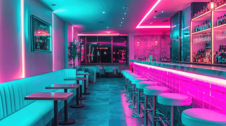 A beautifully designed bar interior featuring stylish seating and elegant decor. The modern space creates a vibrant and inviting atmosphere perfect for relaxation.
