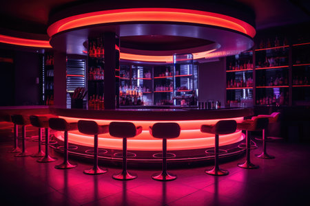 Colorful interior of bright and beautiful night club, Interior of a night club with bar counter with chair, Ai generated