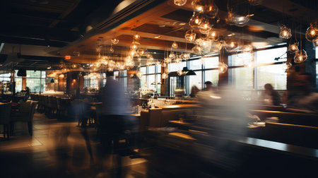 crowded restaurant or pub with people dining and waiters, bartender and chefs working, crowd drinking and eat in full bar or cafe, blurred motion. High quality photo