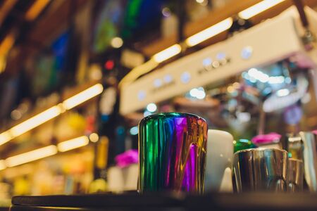 Coffee shop bar counter with wine bottles. Modern design. Vintage atmosphere.