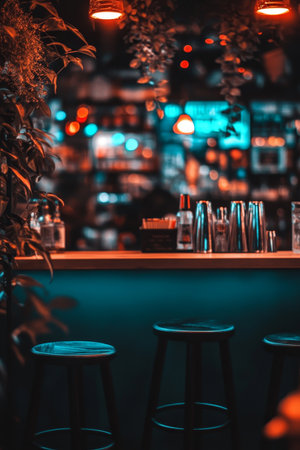 Empty Modern Bar Interior, Blurred Background, Teal and Orange Lighting, Plants, and Bar Stools