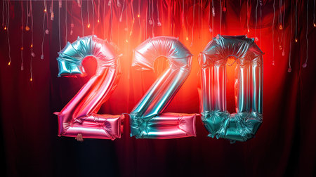Happy new year 2021. Colored foil balloons on red curtain background. AI Generative