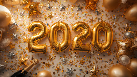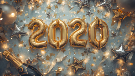 Happy new year 2020 gold celebration balloons with a champagne bottle