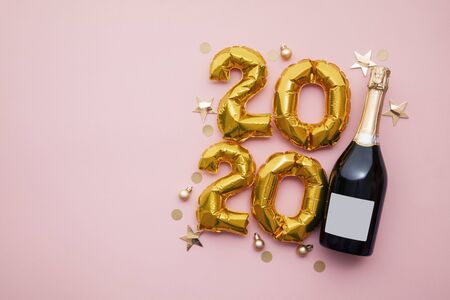 Creative Christmas and New Year composition with golden champagne bottle, confetti stars and 2020 numbers. Flat lay.