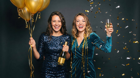 two women in dresses celebrating with champagne and golden balloons surrounded by confetti, smiling and enjoying a festive event together
