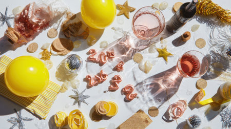 A festive flat lay arrangement for New Years Eve, featuring champagne glasses, balloons, and confetti.