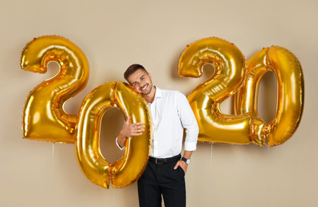 Happy young man with golden 2020 balloons on beige background. new year celebration