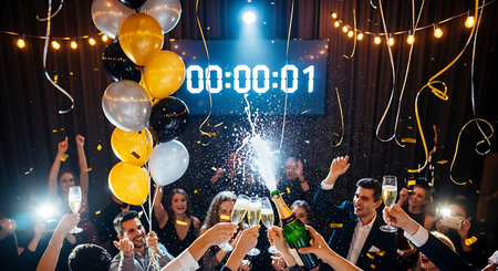 Friends cheer with champagne and confetti as the countdown clock nears midnight.