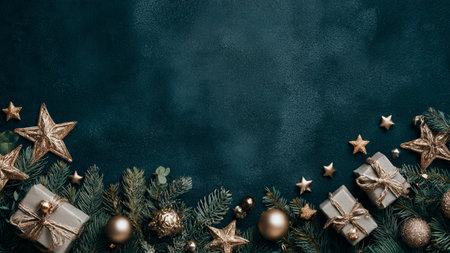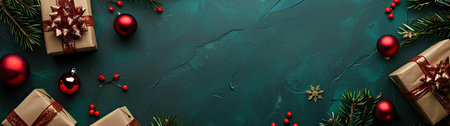 A top-down shot of a Christmas flat lay featuring gift boxes, fir branches, and shiny balls, with plenty of room for your own holiday message.