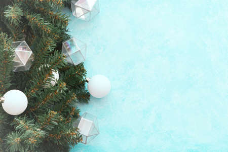 Christmas flat lay, banner. A composition of spruce branches of shiny white balls on a blue background. Winter holiday design copy space, top view. The concept of Christmas, New Year, winter mood.
