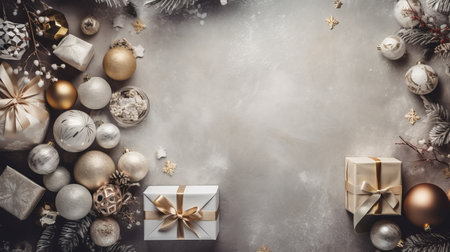 A Christmas setup presented in a flat lay with various holiday trinkets arranged against a neutral backdrop AI generated illustration