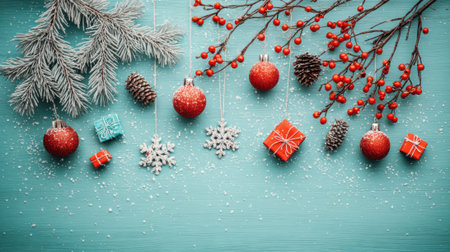 A beautiful arrangement of Christmas ornaments, pine cones, and berries on a teal background, creating a festive holiday scene.
