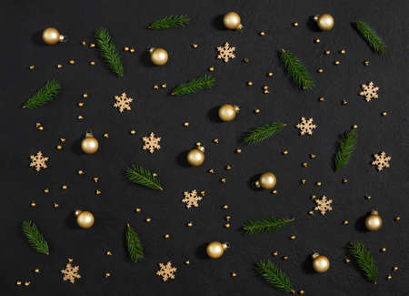 Christmas pattern with fir branches, golden baubles and snowflakes on a black background. New Year composition. Greeting card. Top view, flat lay.