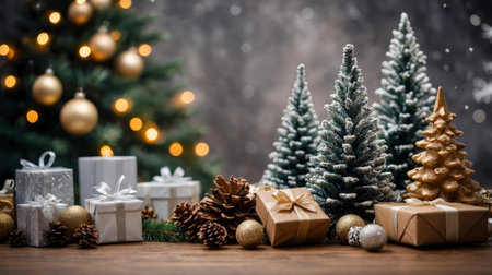 Festive scene with Christmas gifts and decorated trees creating a holiday mood with snow, ideal for seasonal greetings and winter promotions.