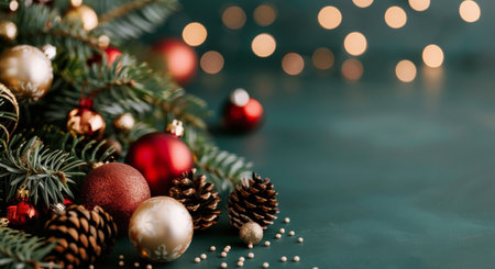 Christmas decorations with red baubles and berries on lush green pine branches. The dark green glittery background adds elegance to the festive composition.