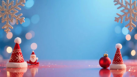 A Christmas-themed background featuring blue-wrapped gifts, pine branches, ornaments, and festive decorations on a blue surface. The image captures the holiday spirit and winter celebrations.