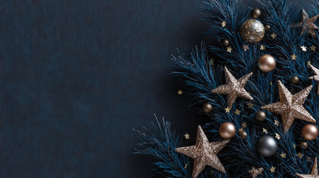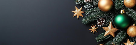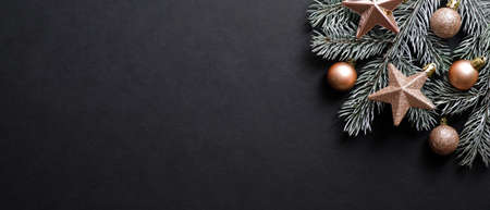 Christmas banner. Black Xmas background with pine tree branch decorated cooper color balls and stars. Christmas frame, greeting card template, web banner mockup. Flat lay, top view, copy space