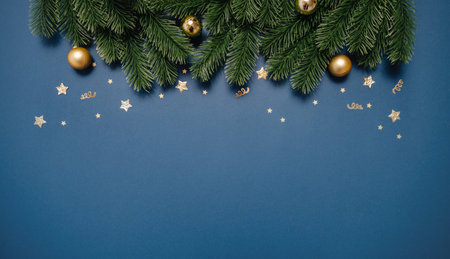 Beautiful festive New Year composition with lush fir branches, sparkling ornaments, glitter accents, and a blank space for text or holiday greetings
