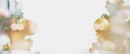 Christmas background. Double exposure panoramic Christmas tree with soft Bokeh lights on white background