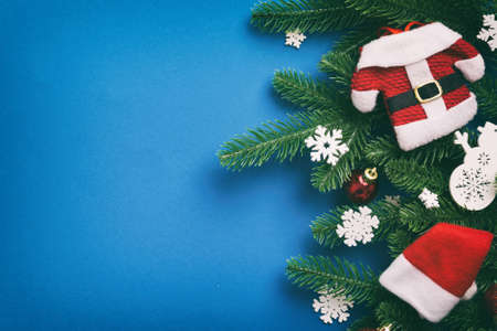 Christmas background with fir branches and Christmas decor. Top view, copy space for text.