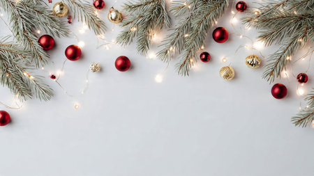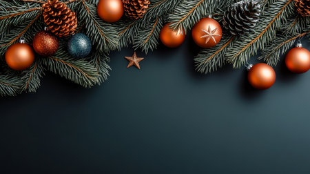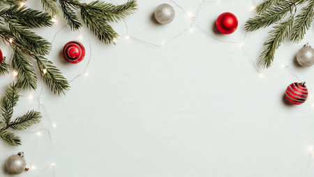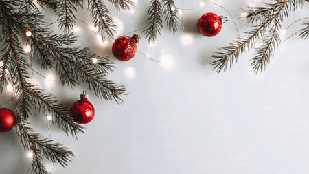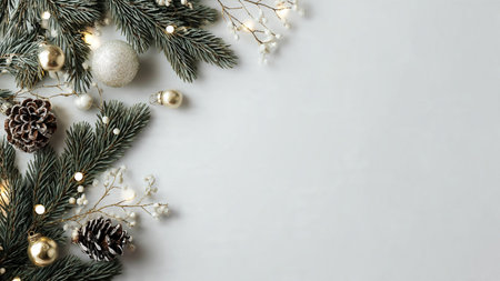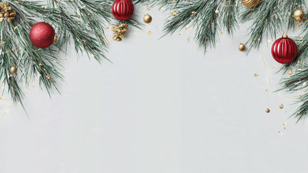 Elegant minimalist holiday background with pine branches and ornaments.