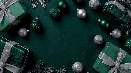 Matte green border decorated with reflective silver stars and small gifts.