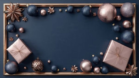A soft-lit holiday mockup highlighting refined rose-gold ornaments arranged over deep blue tones.