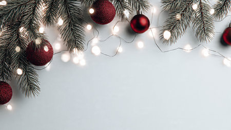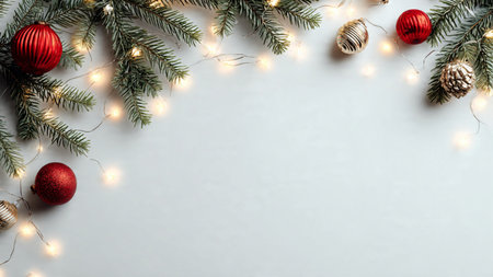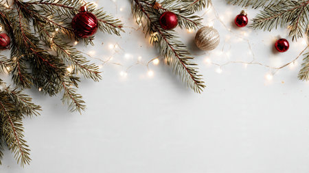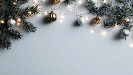 Elegant minimalist festive background with pine greenery and fairy lights.