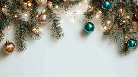 Festive Christmas scene with fir branches, ornaments, and lights.