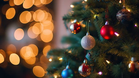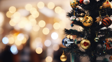 Christmas tree with decorations and lights bokeh background. Merry Christmas and Happy New Year